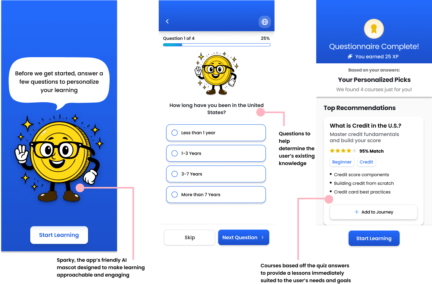 With our core insights and design frame in place, we shifted into refining the problem space. Synthesizing user pain points revealed opportunities to make financial learning more engaging and adaptable, which led us to explore a gamified learning approach, designed to simplify complex financial systems while keeping users motivated throughout their financial journey.