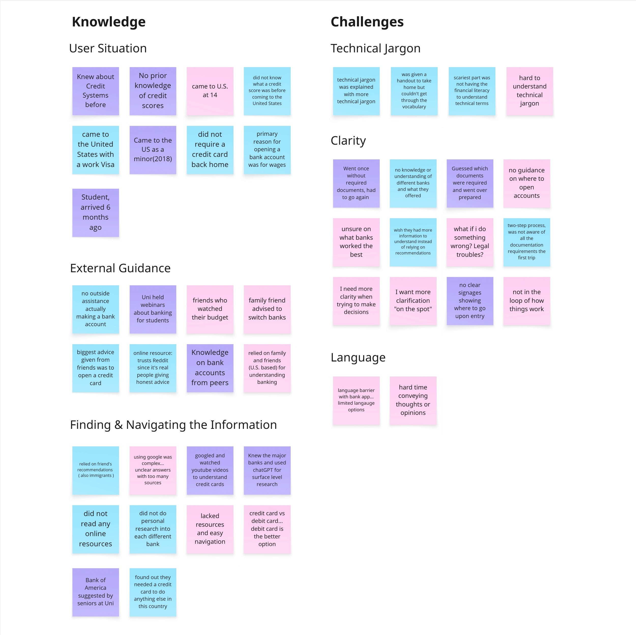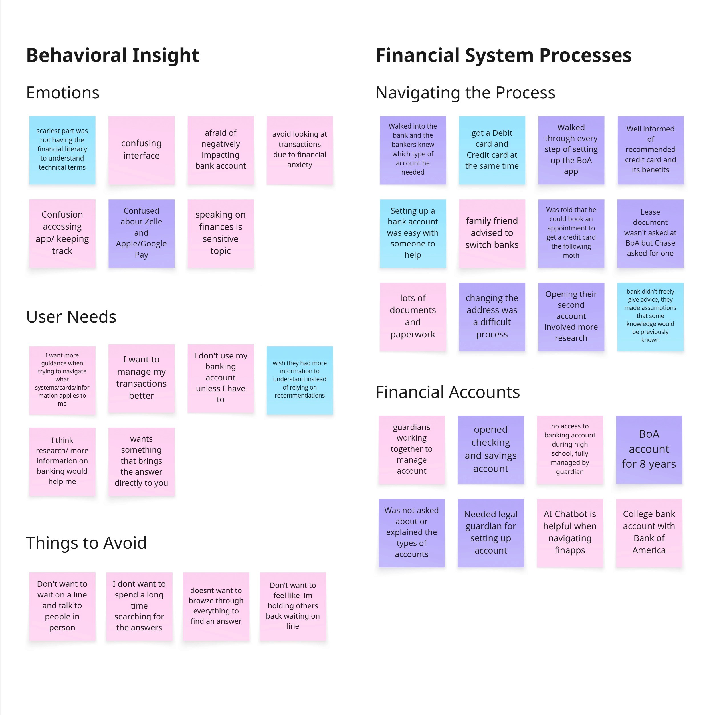 With our process in place, each teammate conducted a user interview to understand what people were really struggling with. I led one of these interviews, focusing on participants’ banking habits, challenges, and sources of financial knowledge. Together, we turned our findings into affinity maps and mental models, making patterns and behaviors clearer.